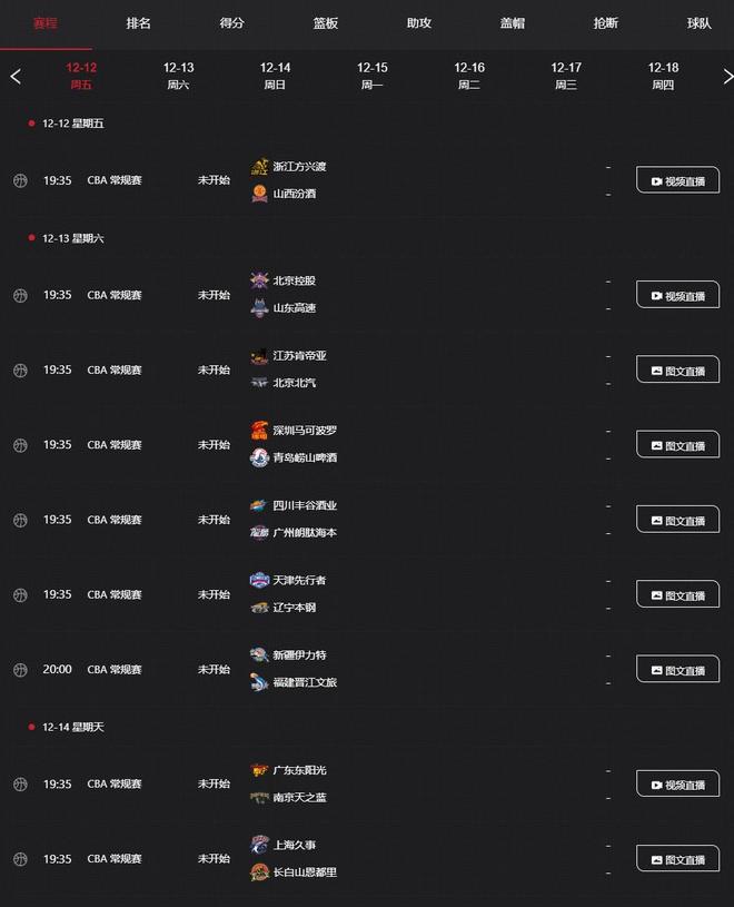 通过整理,目前央视节目单中共公布了未来7个比赛日(12月12日-12月18日)的转播计划,在这7个比赛日中有27场比赛,其中计划进行转播的比赛仅为3场,分别是揭幕战广厦vs山西、北控vs山东、广东vs南京。