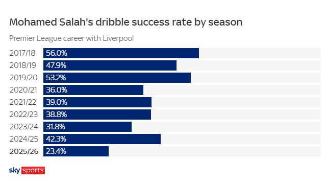 萨拉赫为什么无法频频过人了?卡拉格认为萨拉赫体能下降,尽管听上去有些残酷,但那个过人如麻的边锋已经成了过去式。在本赛季,萨拉赫的突破成功率低于25%,这是其8年利物浦生涯第一次低于25%。