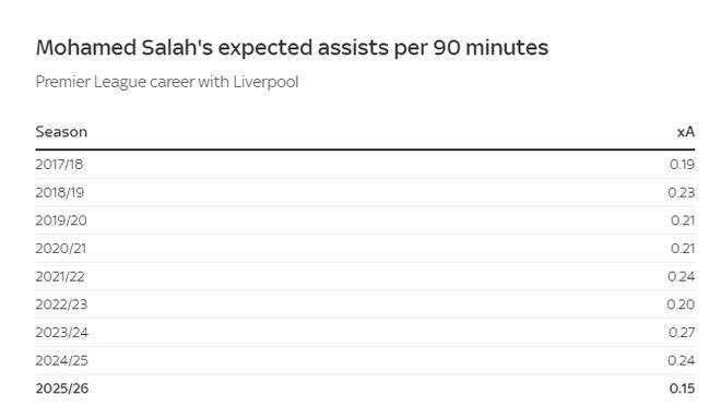 在无法破门得分的同时,萨拉赫为队友创造出的机会数量也明显减少。预期助攻是衡量球员创造力的公平指标,因为这一数据并不依赖于队友的破门能力。从下图来看,萨拉赫同样处于历史最低水平。