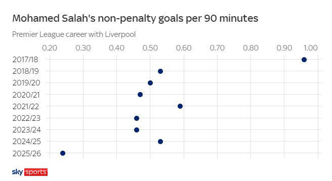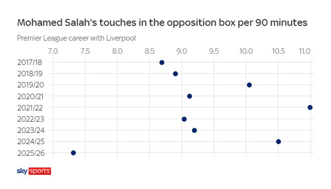 萨拉赫本赛季在对手禁区内的场均触球次数同样下滑,而且又一次创造历史新低。
